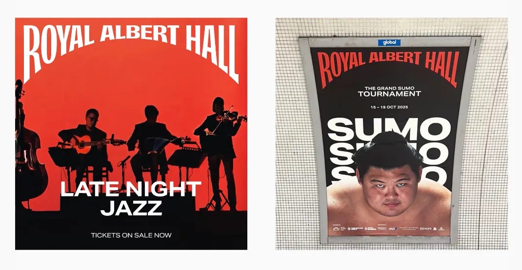 The Royal Albert Hall (that’s our Carnegie Hall, for readers in the USA) rolled out a fun rebrand from Brandpie. I love the archway/dome imagery in the new masthead, with that interesting Victorian/Art Nouveau feel that firmly shouts the strongest part of the brand — the internationally recognisable name.