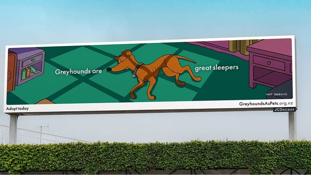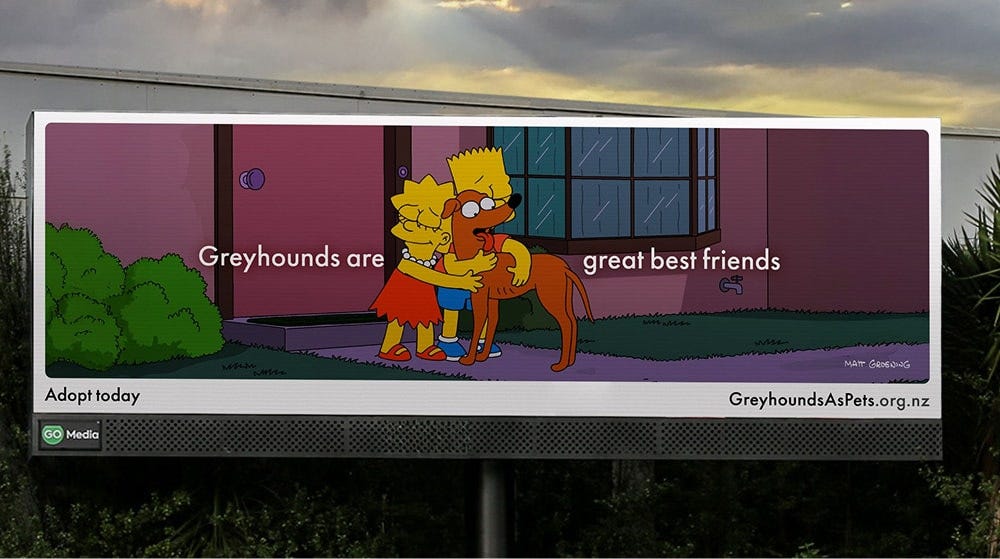 The typical āIP mashupā campaign doesnāt usually hit as hard as it used to, thanks to everything having a multiverse Fortnite tie-in and Disney owning everything. But New Zealand agency Special teamed up with The Simpsons (so⦠er⦠Disneyā¦) to create an adorable set of billboards for Greyhounds As Pets, a charity encouraging the rehoming of ex-racing snoots.